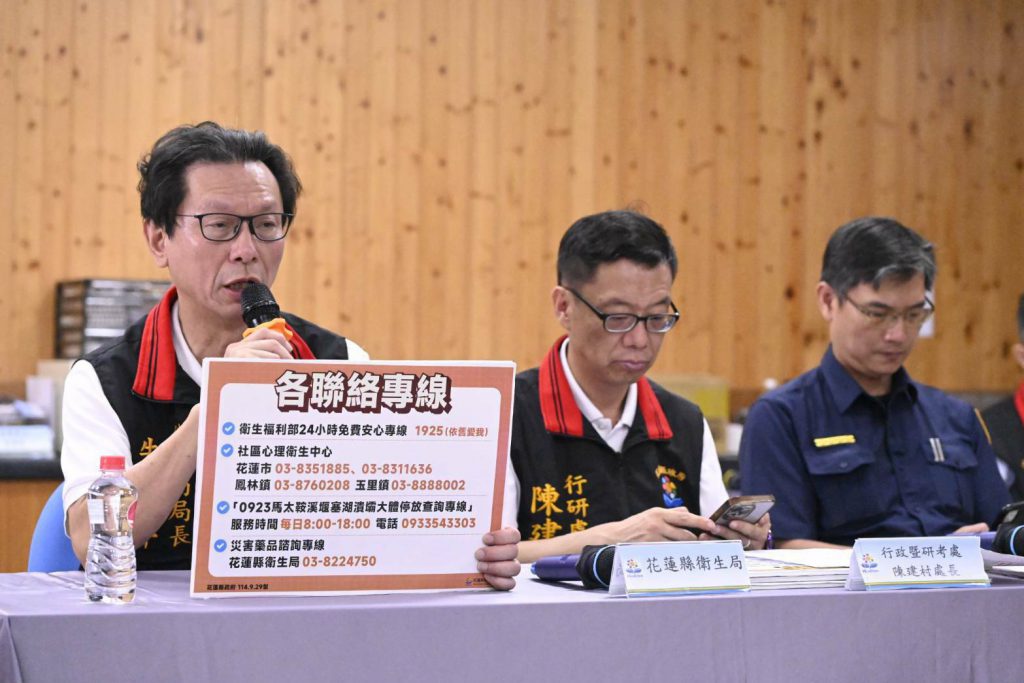 花蓮縣政府今(29)日由行政暨研考處長陳建村及衛生局長朱家祥主持|「馬太鞍堰塞湖潰壩救災進度說明會」,向各界報告上午國軍於加里洞附近尋獲一具遺體(身份待確認),以及目前各項災後復原工作進度,並向所有罹難者鄉親表達最深的哀悼,並全力持續搜救失聯的鄉親。