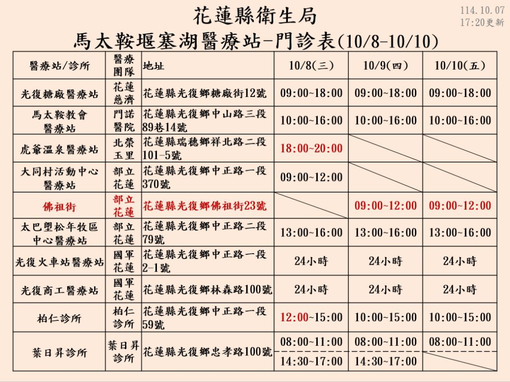衛生局報告,截至10月7日,流感疫苗施打已達962人次,新冠疫苗330人次。光復鄉居民、志工及救災人員請儘快施打流感疫苗,有症狀者亦應配戴口罩。大進國小及馬太鞍教會設有心理諮詢站,提供創傷症候群心理輔導,歡迎災民利用,另馬太鞍堰塞湖醫療站新增佛祖街23號站點,服務時間為上午9時至12時。。