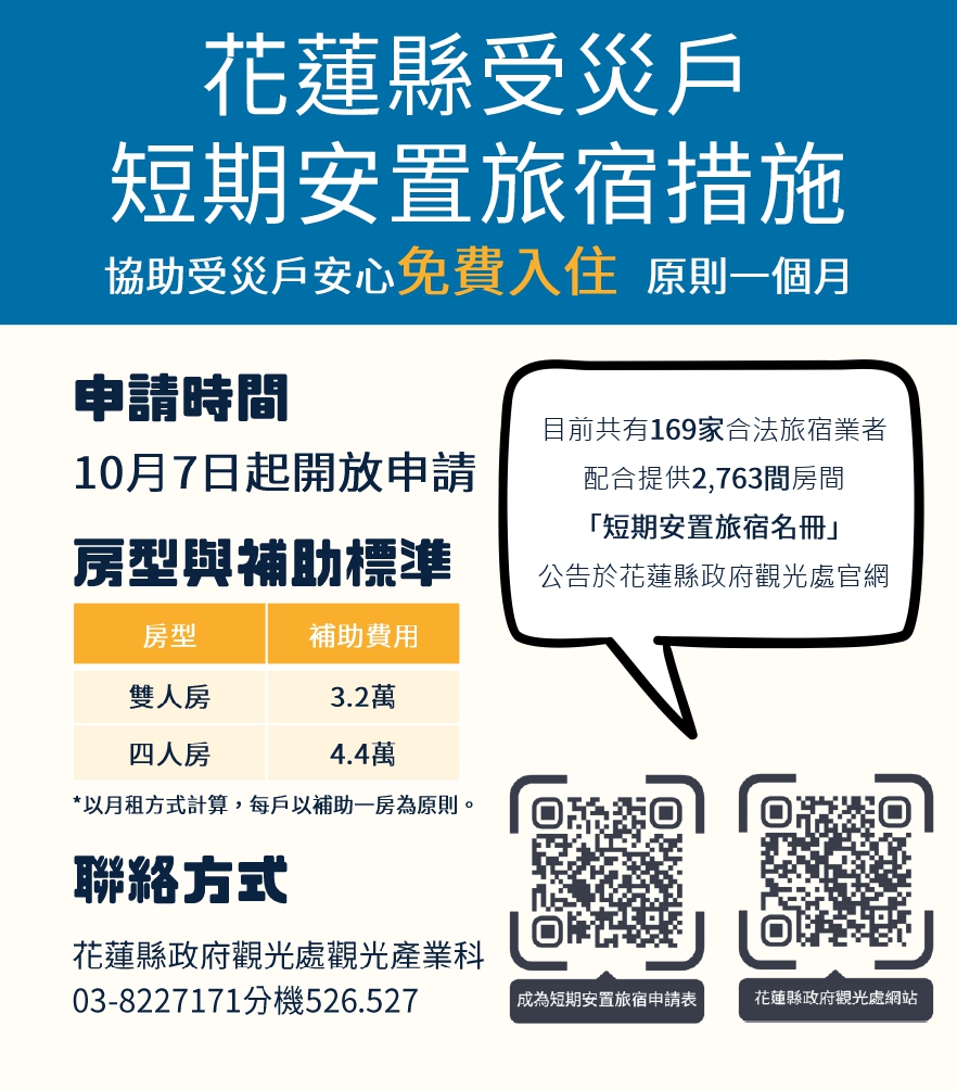 花蓮縣政府今(8)日召開馬太鞍堰塞湖潰壩救災進度說明會,由行政暨研考處長陳建村主持,社會處、衛生局、客家處及警察局等相關單位出席。縣府表示,自10月7日起開放災區短期安置旅宿申請,觀光處網站公布169家配合業者,共提供2,763間各類房型,雙人房每月補助3萬2千元,四人房每月補助4萬4千元,每戶補助一房為原則,請鄉親善加利用。