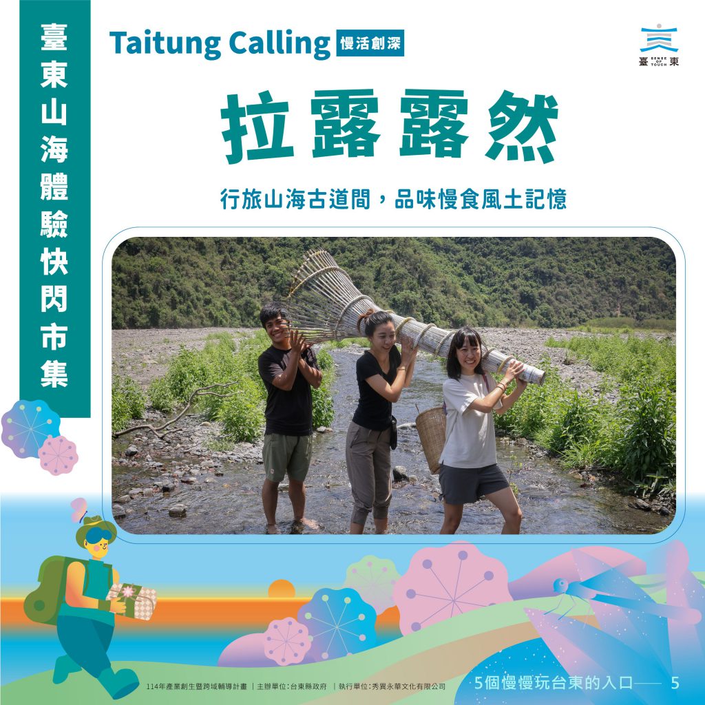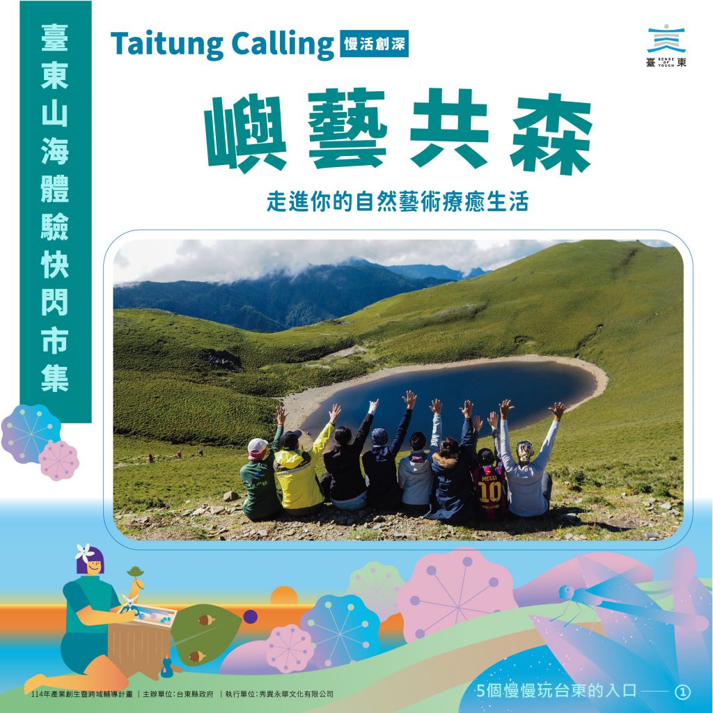 臺東縣政府推動「慢活創深」產業創生暨跨域輔導計畫,去年度以「DIG DEEP TAITUNG」為核心,強調深度挖掘在地文化,今年則以「Taitung Calling」為主題,象徵臺東已經準備好,帶著滿滿的好玩體驗與在地魅力,邀請呼喚大家走進臺東、親身感受。縣府將於10月11日、12日國慶連假期間,在台北圓山花博園區 MAJI MAJI集食行樂玻璃屋廣場,舉辦【臺東山海體驗快閃市集】,讓大家在活動中感受臺東慢生活的熱情與能量。