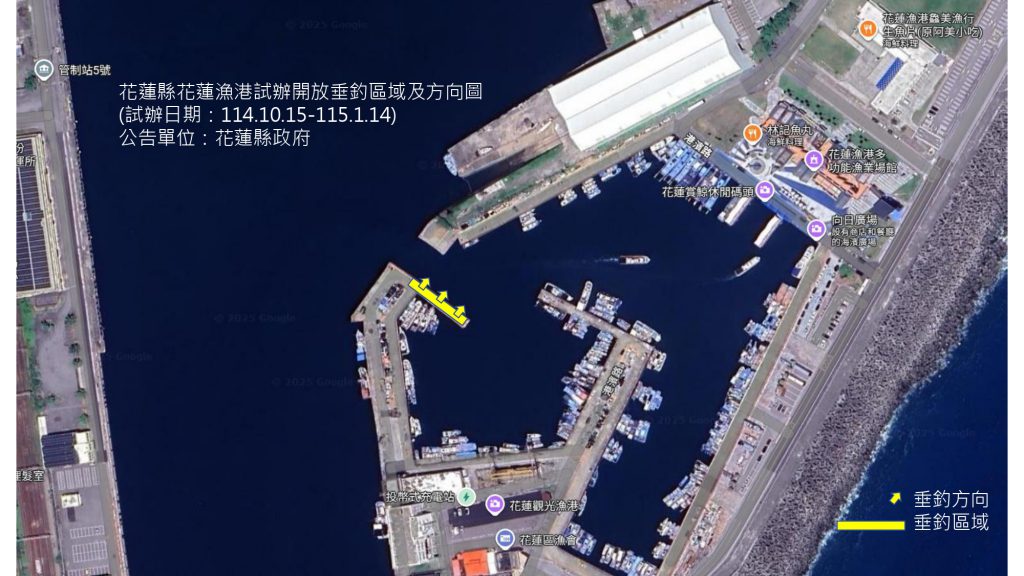 花蓮縣政府推動「友善釣魚」與永續利用海洋資源的理念,即日起試辦開放花蓮漁港西凸堤垂釣為三個月,並同步公告相關安全規範及注意事項。縣府表示,漁港不僅是漁民作業的重要場域,更是民眾親海、體驗漁業文化的空間,期盼透過試辦措施,讓釣友能安全垂釣,也讓港區作業與生態保育能兼顧,建立共榮共存的友善環境。