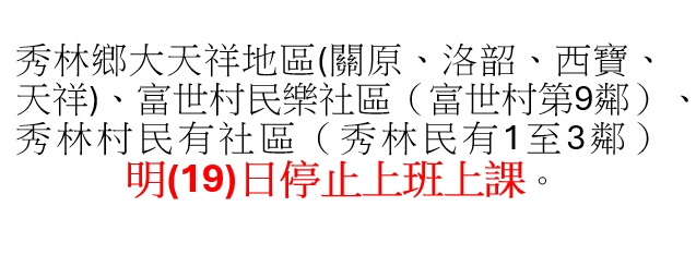 因應立霧溪燕子口堰塞湖紅色警戒發布,本縣秀林鄉公所,依據天然災害停止上班及上課作業辦法第7條第2款宣布秀林鄉大天祥地區(關原、洛韶、西寶、天祥)、富世村民樂社區(富世村第9鄰)、秀林村民有社區(秀林民有1至3鄰)明(19)日停止上班上課。