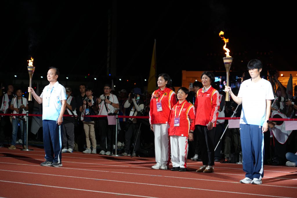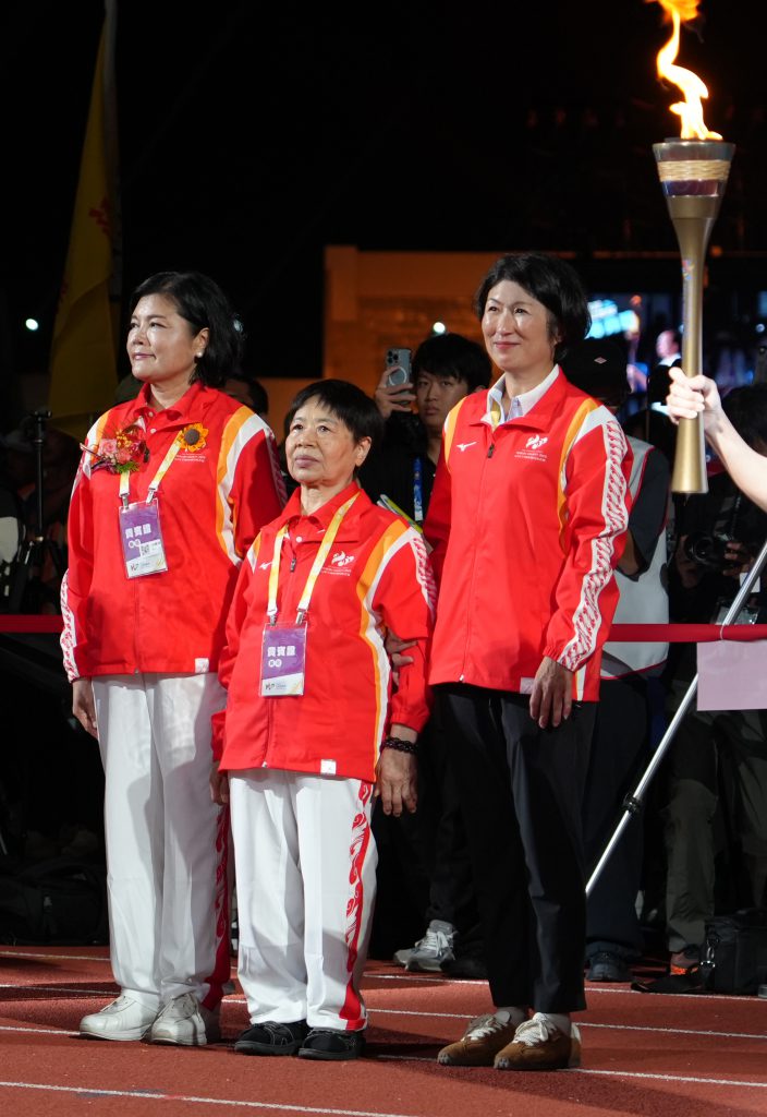 饒慶鈴、雲林縣張麗善縣長與陳樹菊阿嬤也共同傳遞了一小段全運會聖火,向大會致敬、也把更多臺東的美好與良善傳達給更多人。