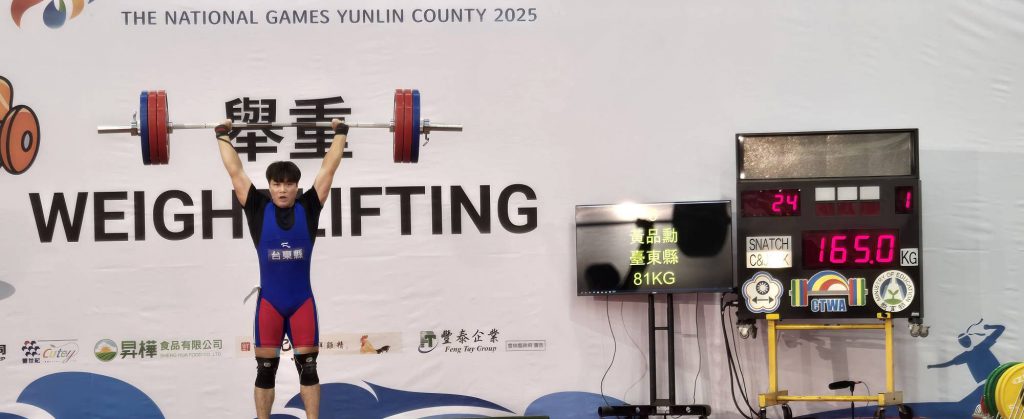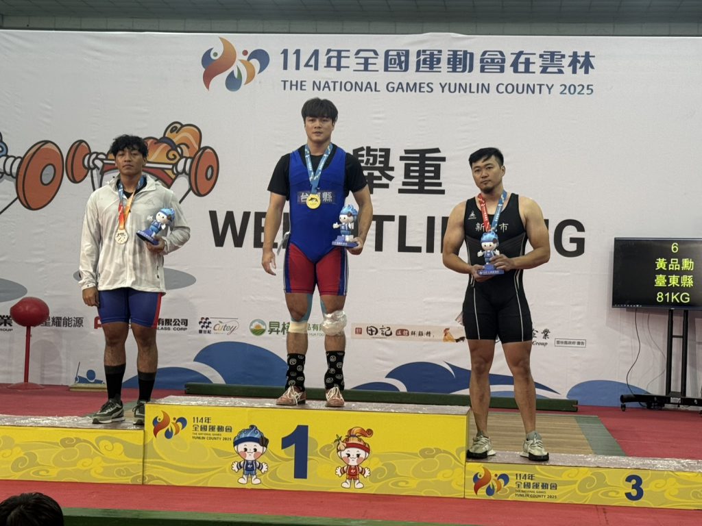 男子舉重81公斤級比賽,臺東縣好手黃品勳不負眾望,分別在挺舉項目舉起165公斤、抓舉145公斤,以總合310公斤,為臺東縣再添一金。