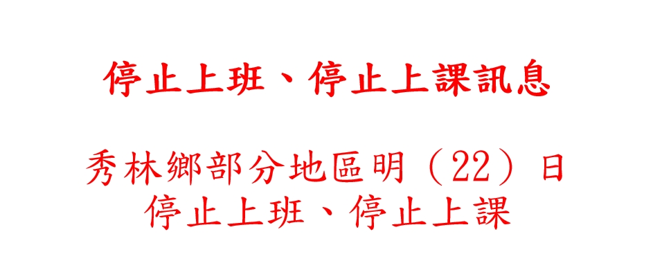 花蓮縣政府今(21)日晚間發布,秀林鄉部分區明(22)日,停止上半及提使上課快訊: