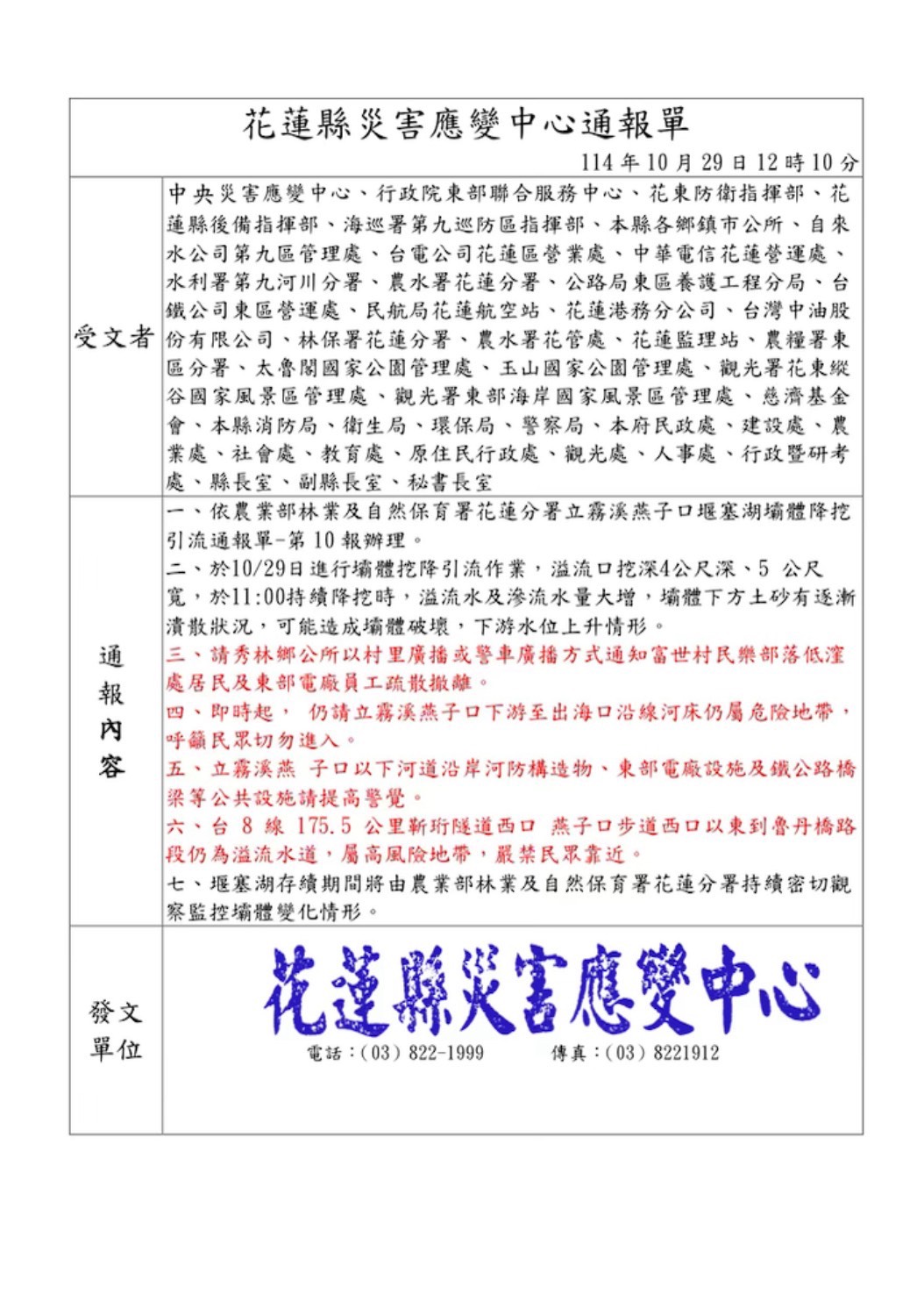 今(29)日上午林保署花蓮分署通知,目前立霧溪落石阻塞河道之開口加大,溢流水道水量擴大並沖刷壩體,將持續造成壩體破壞或潰決,引發立霧溪下游水位抬升,請秀林鄉民樂部落居民配合鄉公所進行疏散撤離,並請鄉親勿靠近河道周圍。