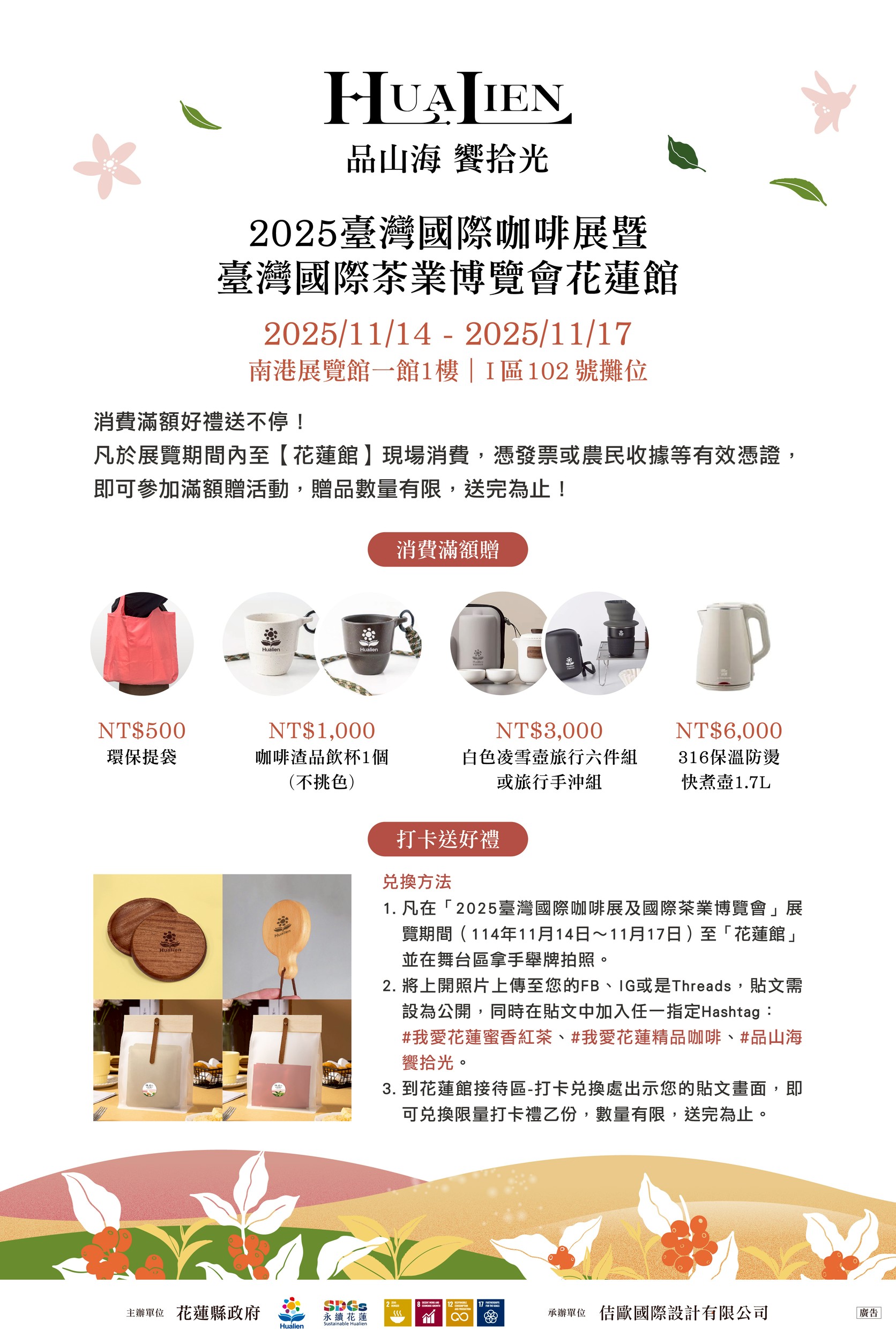 花蓮縣政府攜手12家在地蜜香紅茶及4家精品咖啡廠商共同參與「2025臺灣國際茶業博覽會」與「臺灣國際咖啡展」,展期於114年11月14日至17日,在南港展覽館一館舉辦。花蓮縣政府期待藉由參展,展現花蓮縣多年推動地方農產業升級與品牌化的豐碩成果。