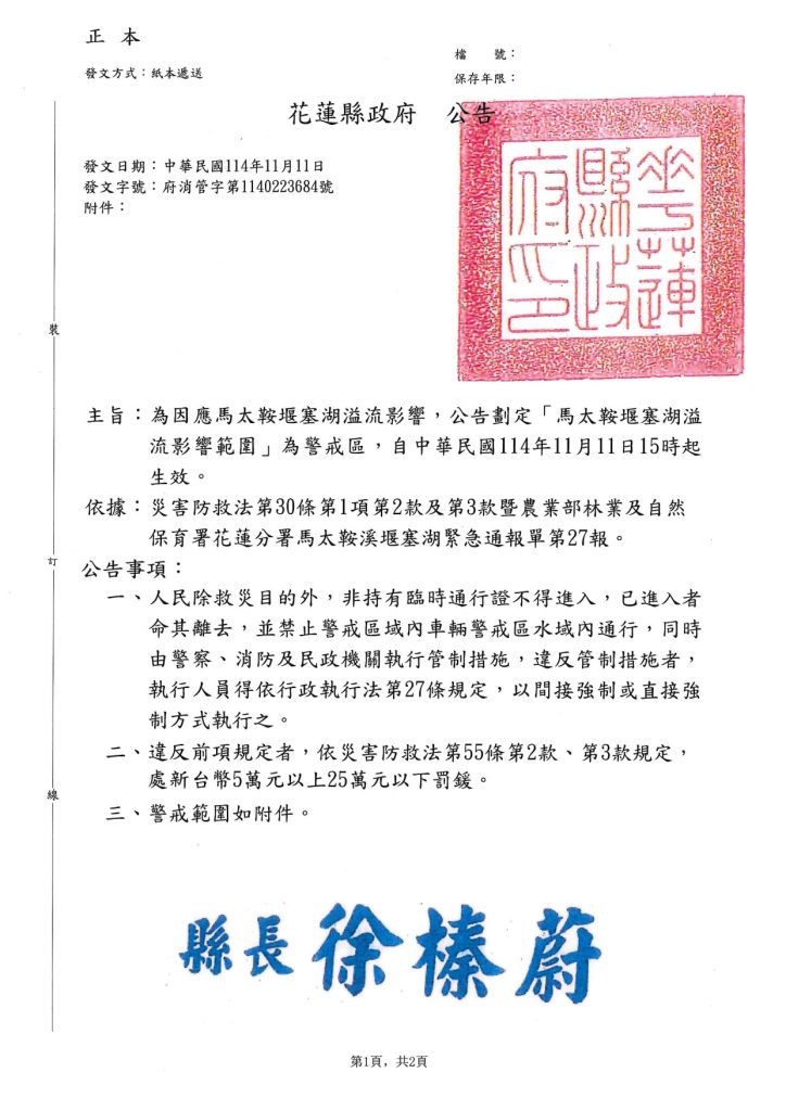 花蓮縣政府說明,9月23日堰塞湖潰壩後導致河床抬升、地形劇烈變化,區域水文條件不穩,危害因子日益複雜,整體風險明顯升高。依據農業部林業及自然保育署最新通報,目前馬太鞍溪流域仍為紅色警戒區域。