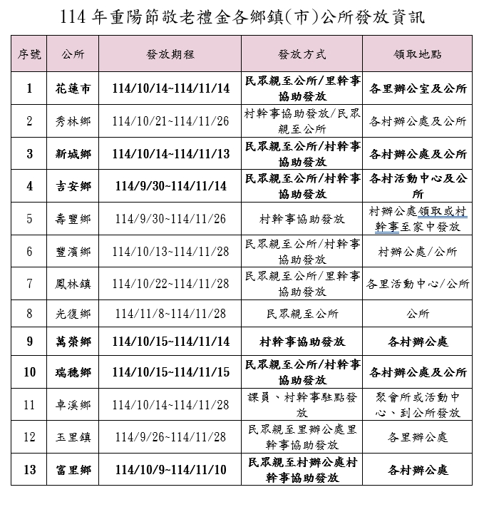 花蓮縣政府自114年9月30日開始發放重陽節敬老禮金至今,初估尚有3,500人尚待領取,縣府提醒申請匯款入帳者,可攜帶存摺銀行補登以確認款項是否入帳,若未入帳者請於114年11月28日前,逕洽戶籍地之公所,確認是否退匯改領現金發放,並可於現場領取重陽禮金。