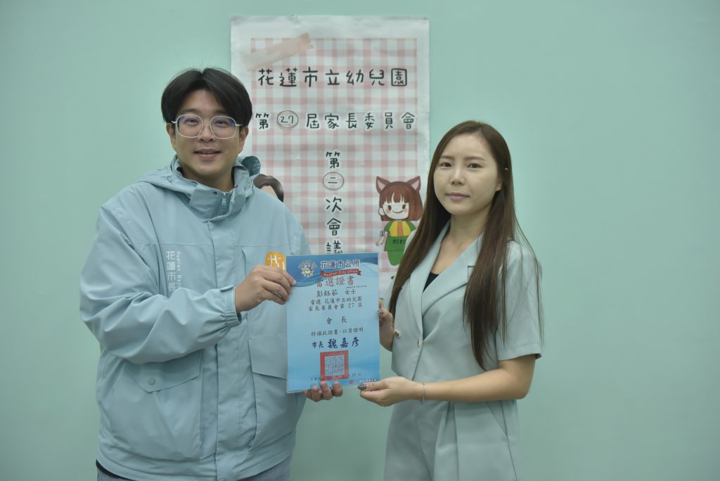 花蓮市長魏嘉彥日前前往花蓮市立幼兒園,為日前選出的第27屆家長委員共23名頒發當選證書。魏嘉彥表示,家長會的支持是教育重要推手,期盼未來一起攜手同心,為學校校務發展與學生健康成長而努力。