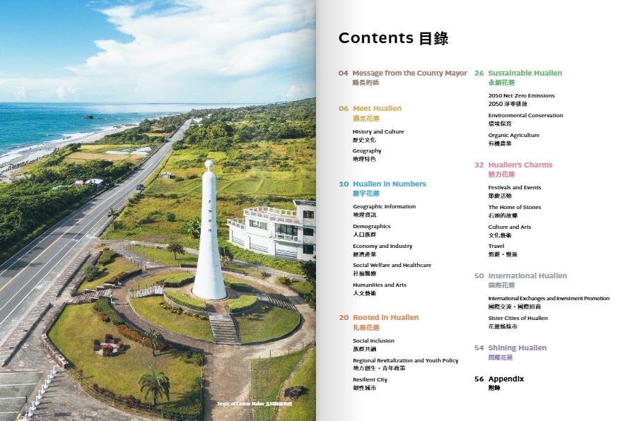 花蓮縣政府表示,《Discovering Hualien花蓮國際城市簡介》以中、英、日、韓四語編印,內容包括「遇見花蓮」、「數字花蓮」、「扎根花蓮」、「永續花蓮」、「魅力花蓮」、「國際花蓮」及「閃耀花蓮」八大單元,簡要敘述花蓮的自然地景、產業發展、文化底蘊及政策成果,規劃於國際交流場合作為外賓的伴手禮,以促進海外讀者、國際友人於第一時間對花蓮有基本認識,進而實地探訪花蓮在地社區、部落、森山河海。