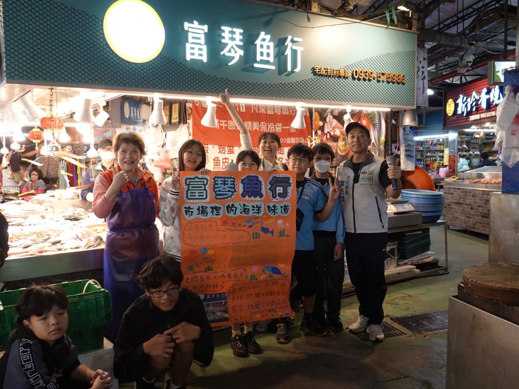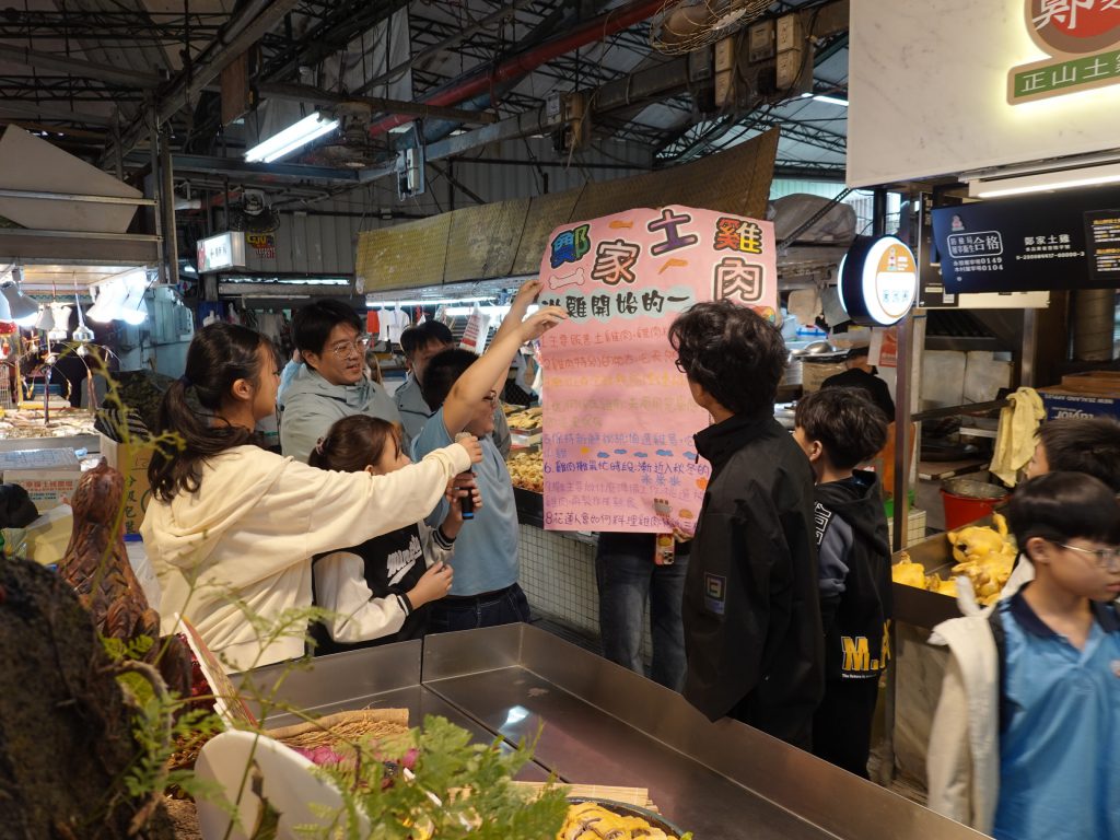 學生們站在攤位前,逐一介紹所蒐集的內容:例如土雞肉的分切方式、肉乾的製作特色、蔬菜與水果的季節差異、海鮮的來源與保存方式、豬肉的加工等。攤商也給予孩子親切的回饋與講評,分享專業知識與經營心得,讓學生在互動中理解勞動價值與攤商日常。