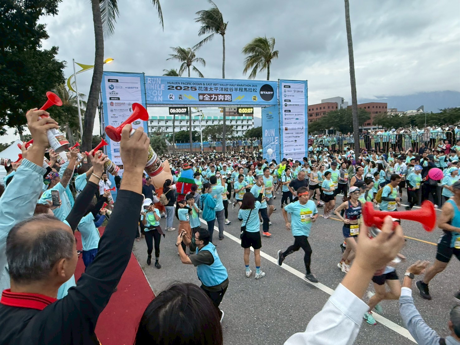 花蓮市公所辦理的「2025太平洋縱谷馬拉松」22日在花蓮濱海最美賽道展開,賽程規劃21K半程組馬拉松、10K小馬組馬拉松松及5K迷你組馬拉松三組進行,共吸引超過3,000位的跑者及家庭成員一同參與。