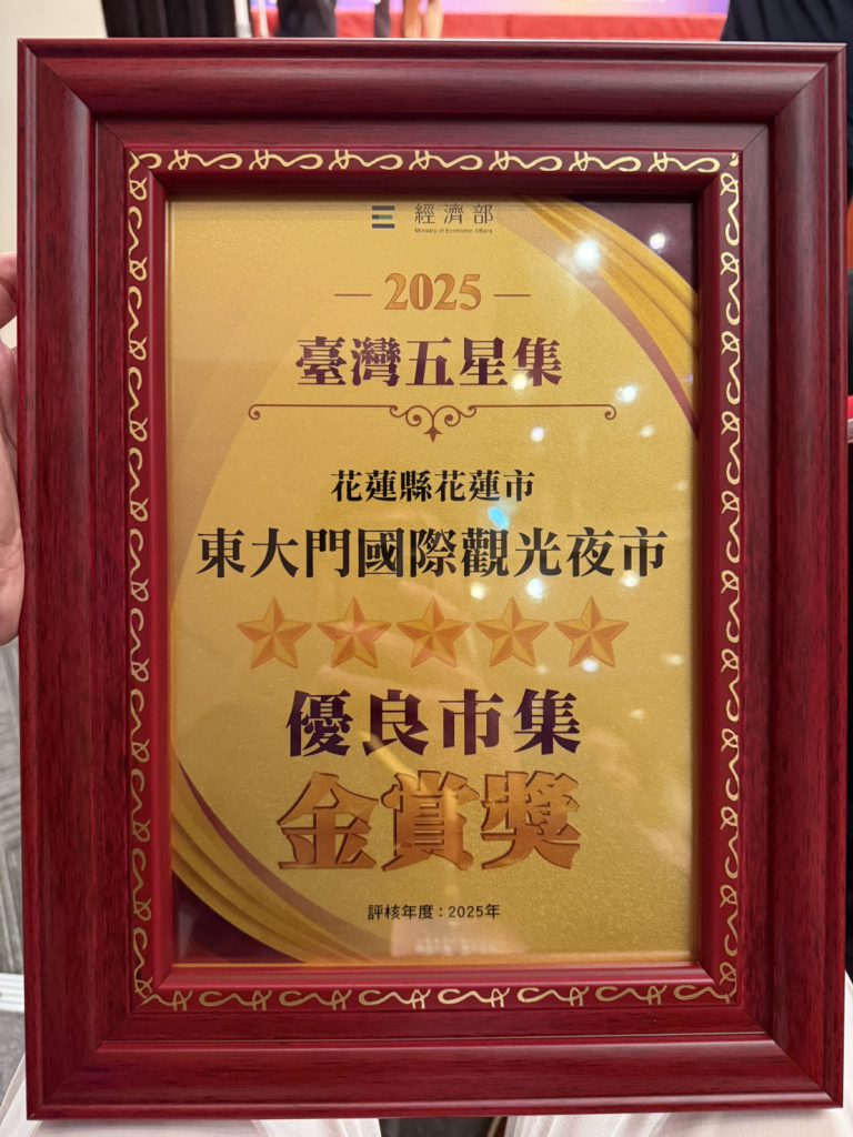 經濟部今(24日)在福華國際文教會館舉辦「2025榮市聚金~優良市集暨樂活名攤頒獎典禮」,花蓮東大門國際觀光夜市風光拿下市集最高榮譽全國唯一五星金賞,其他攤商則榮獲樂活名攤819顆星。花蓮縣政府副縣長顏新章帶領東大門夜市管委會主委及獲獎攤商們到場開心受獎。