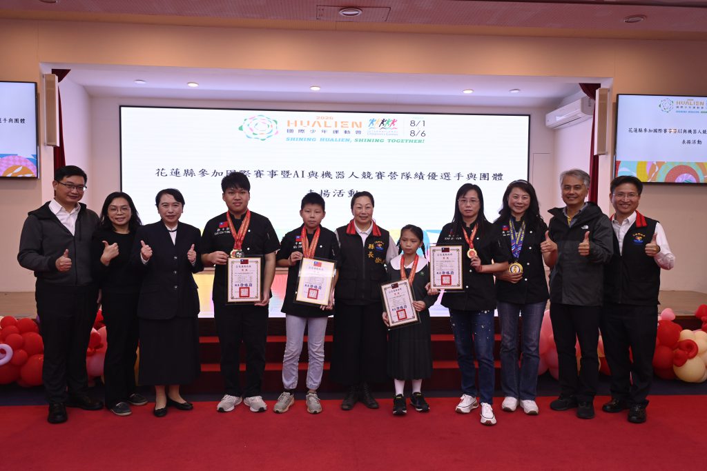 花蓮縣長徐榛蔚今(25)日於縣府大禮堂,為參加共計13項國際賽事暨AI與機器人競賽營隊獲得108面獎牌的獲獎學子頒發獎狀、獎牌,並給予期勉。當縣長頒發獎牌與獎狀時,選手們各個掛著獎牌,在家人與師長的歡呼及掌聲中,一同合影留念,共同見證這份屬於花蓮的驕傲時刻,現場熱鬧非凡。