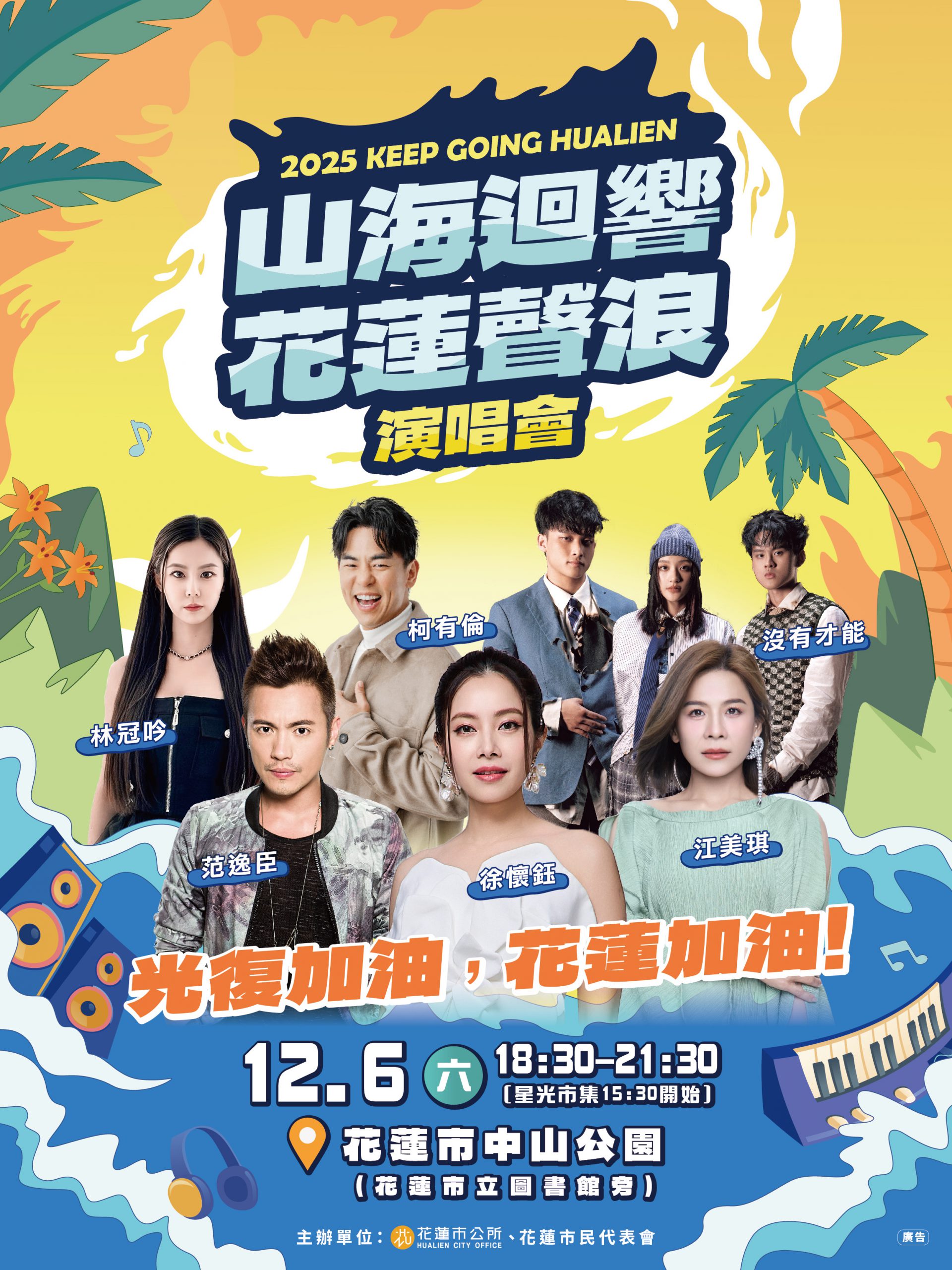花蓮市公所表示,這場演唱會集結眾多實力派歌手與人氣樂團,包括亞洲天后徐懷鈺、搖滾王子范逸臣、情歌天后江美琪、全方位男神柯有倫、創作女聲林冠吟,以及 Z 世代超人氣組合「沒有才能」,他們將輪番帶來經典金曲與震撼舞台,預期將會嗨翻中山公園的夜空。