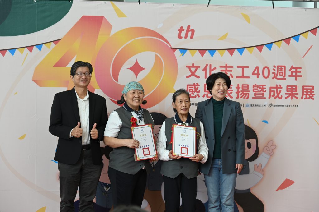 饒慶鈴表示,文化志工長年投入文化推廣與藝文活動支援,陪伴臺東文化志願服務從萌芽到茁壯,40年來志工團像小小的螺絲,默默轉動卻穩固支撐著整座文化殿堂,未來縣府將持續推動志願服務工作,鼓勵更多縣民加入志工行列,讓愛與關懷持續在臺東傳遞與延伸。